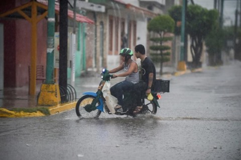 | Des habitants de Escuinapa à moto dans une rue inondée lors du passage de l'ouragan Willa, le 23 octobre au Mexique. |