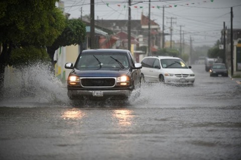 | Des automobilistes dans une rue inondée lors du passage de l'ouragan Willa, le 23 octobre à Escuinapa, au Mexique. |
