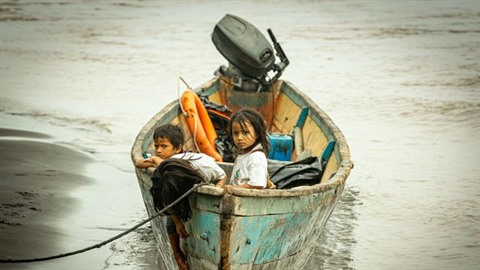 | Des enfants ont trouvé refuge dans une pirogue sur la rivière Coca souillée par du pétrole à Puerto Maderos en Équateur, le 1er février. |