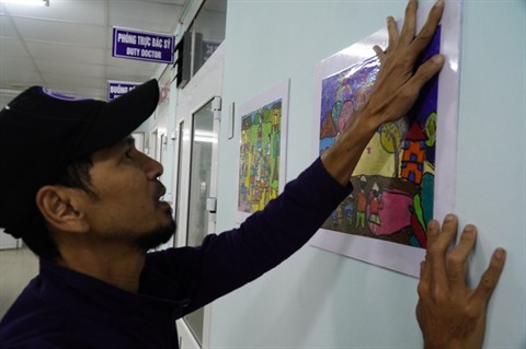 | Le peintre Truong Dinh Dung aux côtés des dessins d’enfants dans un couloir de l’hôpital général de la province de Quang Tri. |