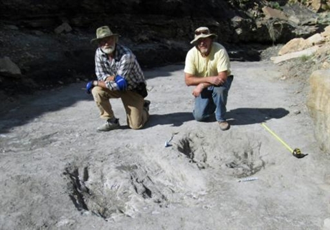 | Une photo fournie par le groupe Nature montre les chercheurs Martin Lockley (droite) et Ken Cart à genoux devant des traces fossiles datant du Crétacé dans l'État du Colorado où ont vécu des théropodes, un groupe de dinosaures, le 7 janvier |