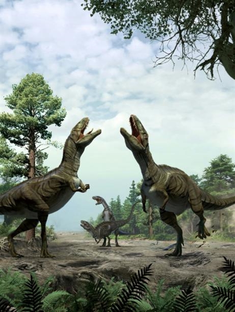 | Une image fournie le 7 janvier par le groupe Nature montre des théropodes, un groupe de dinosaures qui comprend notamment le fameux Tyrannosaure. |