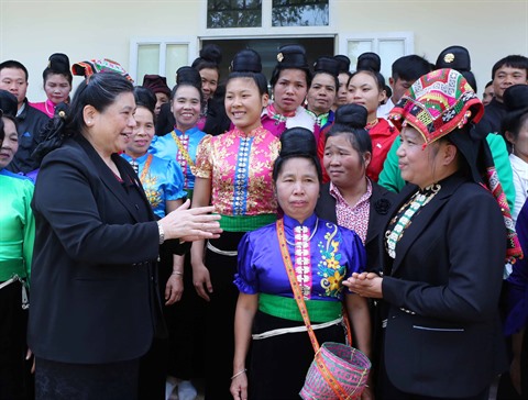 | La vice-présidente de l'Assemblée nationale Tong Thi Phong (gauche) rencontre des femmes |