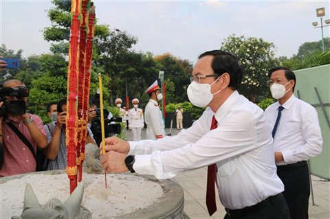 La délégation du Comité du Parti, du Conseil populaire, du Comité populaire et du Comité du Front de la Patrie du Vietnam de Hô Chi Minh-Ville, conduite par le secrétaire du Comité municipal du Parti Nguyên Van Nên, a brûlé des bâtonnets d'encens aux tombes où reposent 14.500 héros morts pour la Patrie.