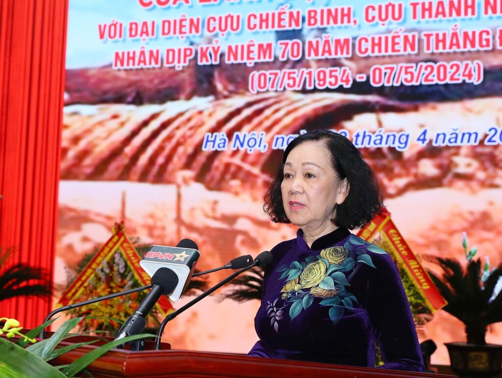 Exprimant son émotion de rencontrer les représentant des millions d'anciens combattants et d'anciens jeunes volontaires à travers le pays, au nom des dirigeants du Parti et de l'État, la permanente du Secrétariat du CC du PCV, Truong Thi Mai, a adressé sa profonde affection, son respect et sa gratitude aux vétérans révolutionnaires aux héros des Forces armées populaires, aux mères héroïnes, aux familles des martyrs, aux soldats blessés, aux anciens combattants et aux jeunes volontaires, aux habitants ayant participé directement à la campagne de Diên Biên Phu.