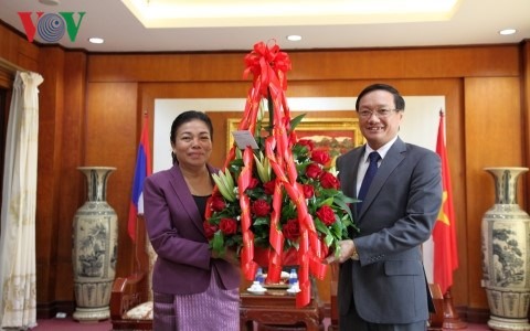| La présidente de la Commission des relations extérieures du CC du PPRL, Sounthone Sayachac, offre un bouquet de fleurs à l'ambassadeur du Vietnam au Laos, Nguyên Ba Hung. |
