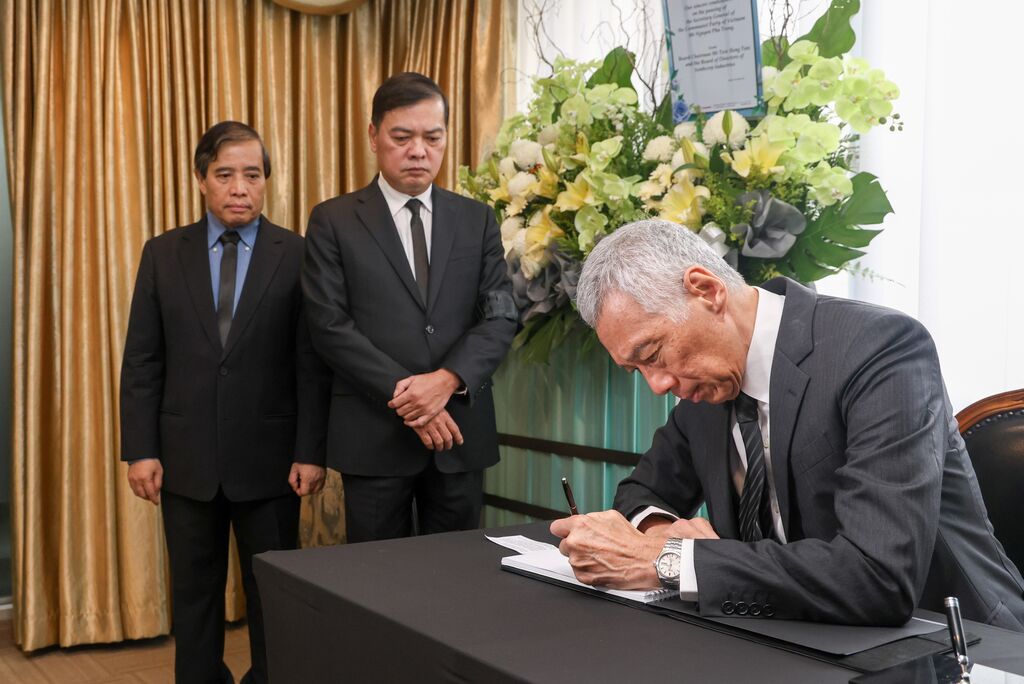 | Lee Hsien Loong, secrétaire général du Parti d'action populaire (PAP), ministre senior et ancien Premier ministre de Singapour, rend hommage au secrétaire général Nguyên Phu Trong à l’ambassade du Vietnam à Singapour. |