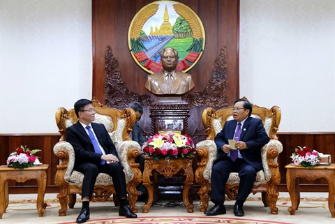 | Le ministre vietnamien de la Justice, Lê Thành Long (gauche), reçu par le Premier ministre laotien Thongloun Sisoulith, à Vientiane, le 2 juillet. |