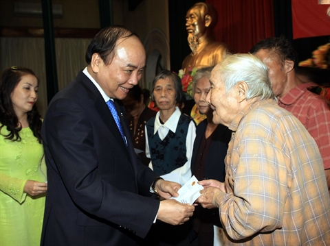 | Le vice-Premier ministre Nguyên Xuân Phuc (gauche) offre des cadeaux à 38 foyers démunis du quartier de Diên Biên, arrondissement de Ba Dinh, le 16 novembre à Hanoi. |