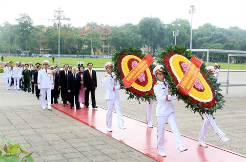 | Une gerbe de fleurs portant l'inscription "Se souvenir à jamais du grand Président Hô Chi Minh" a été déposée. |