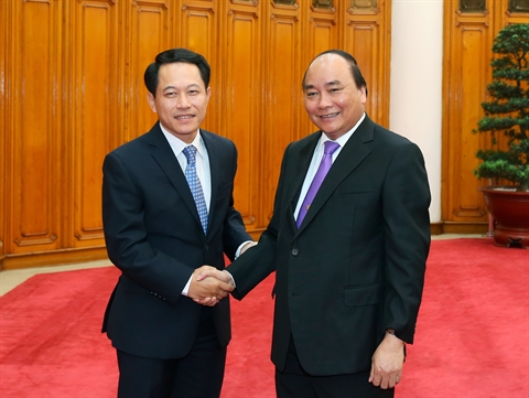 | Le Premier ministre vietnamien Nguyên Xuân Phuc (droite) et le ministre lao des Affaires étrangères Saleumxay Kommasith, le 9 juin à Hanoi. |