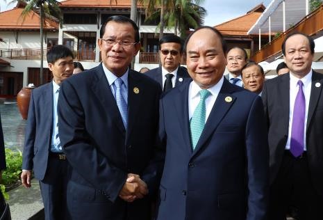 | Le Premier ministre Nguyên Xuân Phuc (droite) et son homologue cambodgien Samdech Techo Hun Sen, le 11 novembre à Dà Nang. |