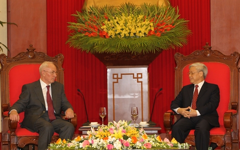 | Le secrétaire général du PCV, Nguyên Phu Trong (droite), reçoit le Premier ministre ukrainien Mykola Azarov, le 16 novembre à Hanoi. |