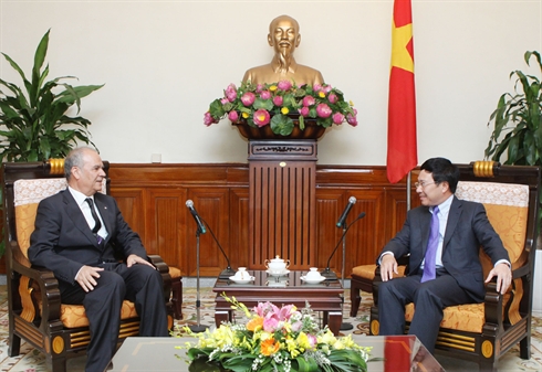 | Le vice-Premier ministre et ministre vietnamien des AE, Pham Binh Minh (droite), et le président de la Fédération mondiale des associations, centres et clubs UNESCO (FMACU), George Christophides, le 30 juin à Hanoi. |