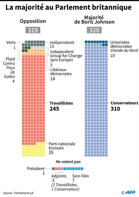 | Composition de l'opposition et de la majorité de Boris Johnson au Parlement britannique, au 29 août. |