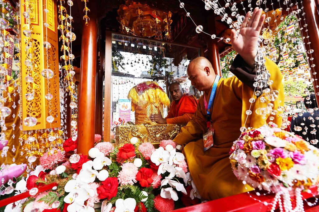 Les reliques sacrées sont conservées au premier étage du hall principal de la pagode Quán Su du 14 mai au matin du 16 mai, dans le cadre des célébrations de la Journée du Vesak 2025 des Nations unies, qui commémore la naissance, l’illumination et le Parinirvana (mort) de Bouddha.