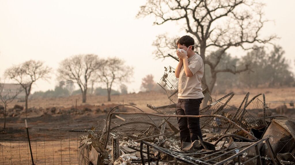 | Un enfant ajuste son masque de protection en fouillant les restes brûlés de sa maison à Paradise, en Californie, le 18 novembre 2018. |