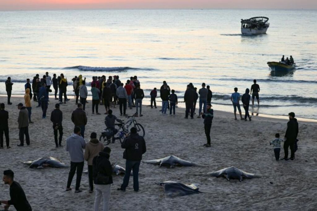 | Des habitants se rassemblent sur une plage de Gaza autour de raies manta capturées par des pêcheurs palestiniens, le 12 mars. |