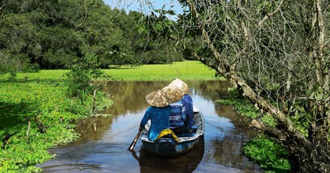 | Balade en pirogue sur le tapis vert de lentilles d’eau dans la forêt de cajeputiers de Trà Su (delta du Mékong). |