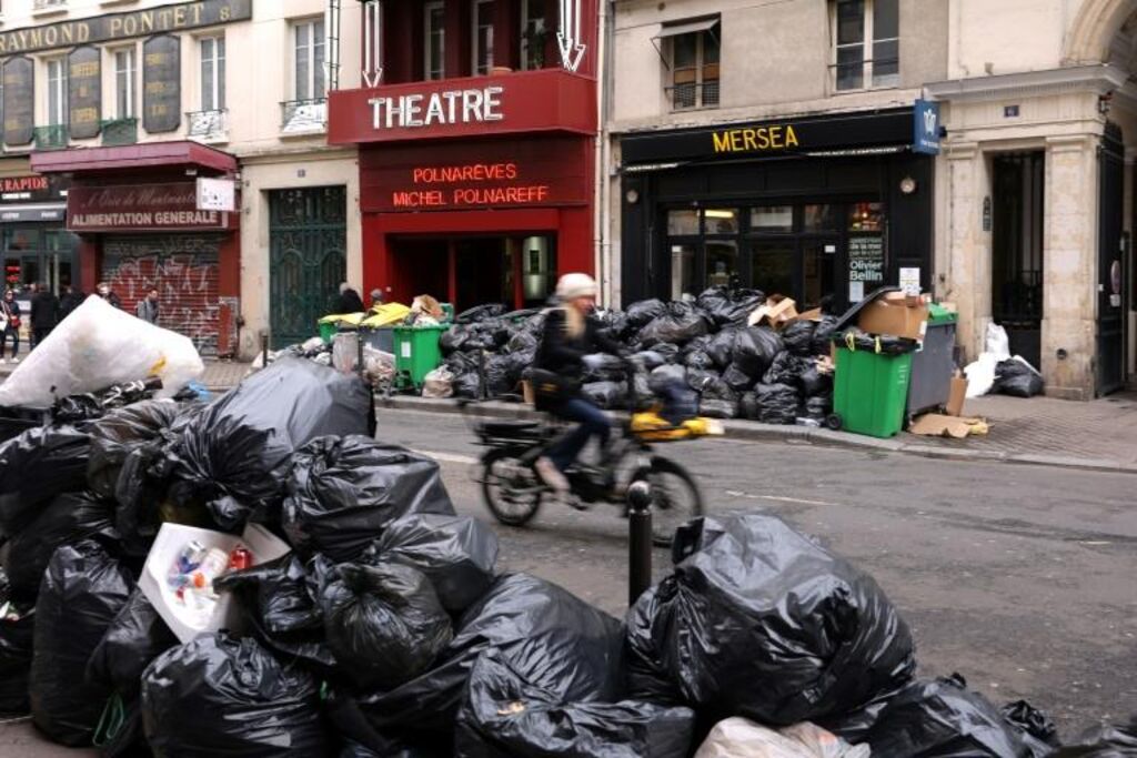| Les poubelles s'accumulent dans une rue de Paris touchée par la grève des éboueurs opposés à la réforme des retraites, le 10 mars. |