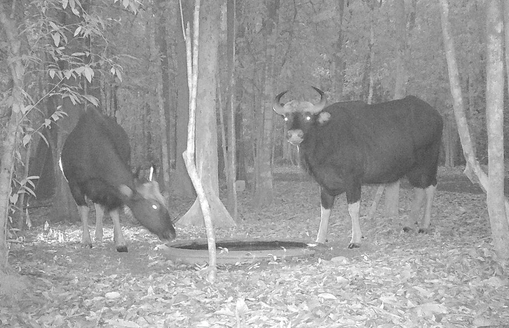 | Deux gaurs boivent de l'eau dans la Réserve naturelle et culturelle de Dông Nai. |