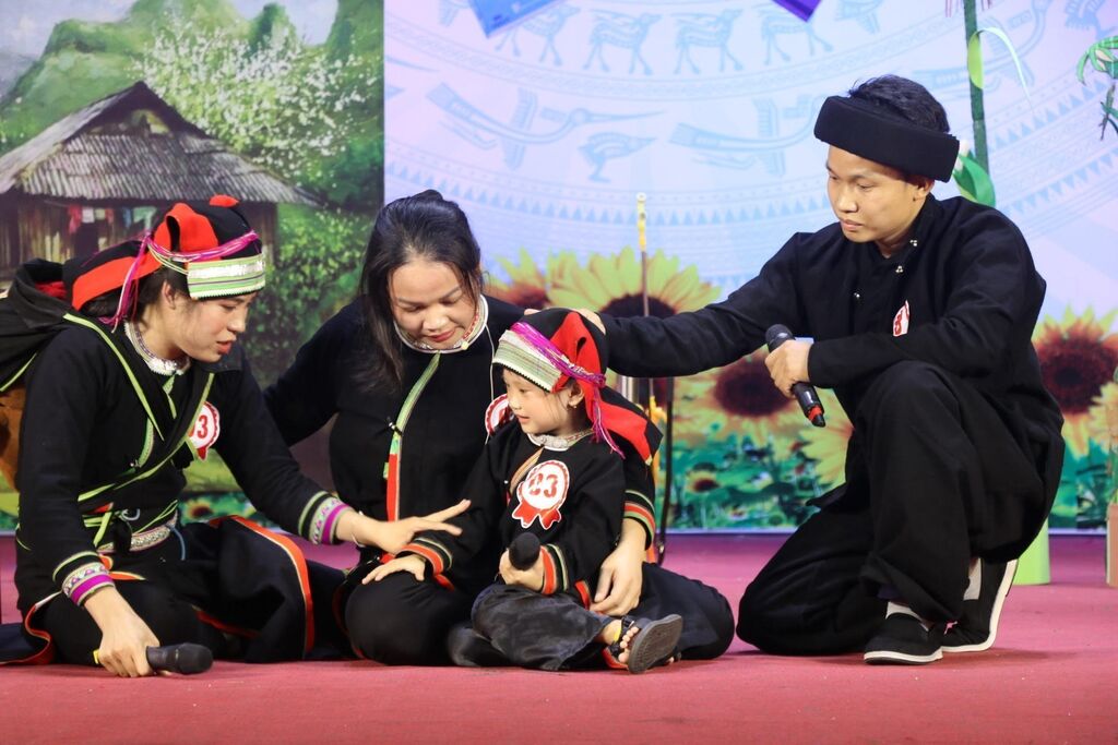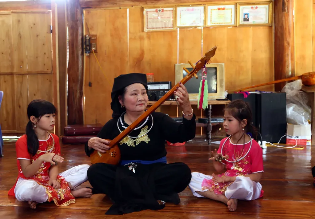 | Une artiste de l’ethnie Tày enseigne le "hat then" (chant divin) à ses petits enfants. |