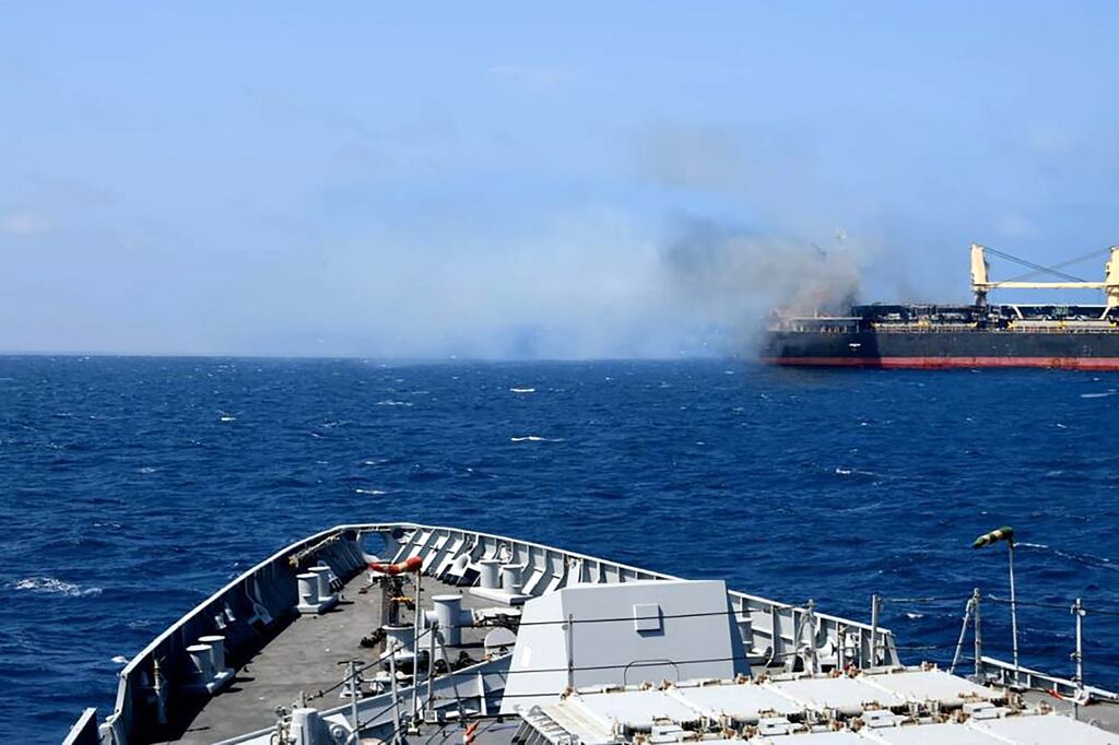 | Un vraquier attaqué par les Houthis en mer Rouge. |