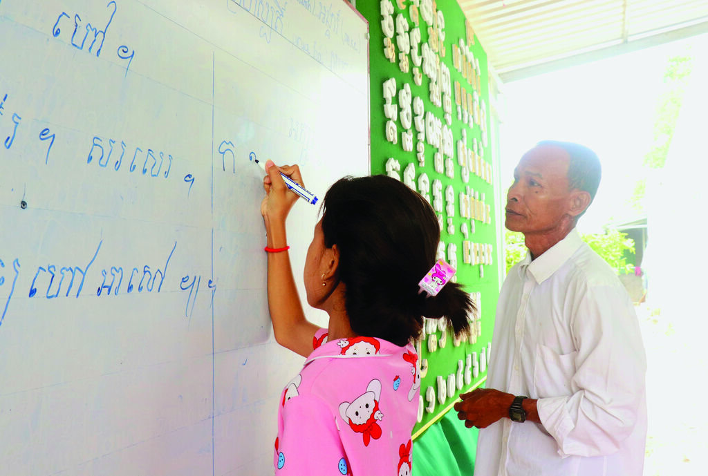 “La plupart des enfants du hameau maîtrisent la langue khmère à l’oral, mais leurs compétences en lecture et en écriture sont limitées. Fort de mon expérience d’enseignement auprès des moines, la communauté me fait entièrement confiance. Malgré mes obligations agricoles, je me consacre à transmettre aux plus jeunes les fondamentaux de l’écriture”, explique-t-il.