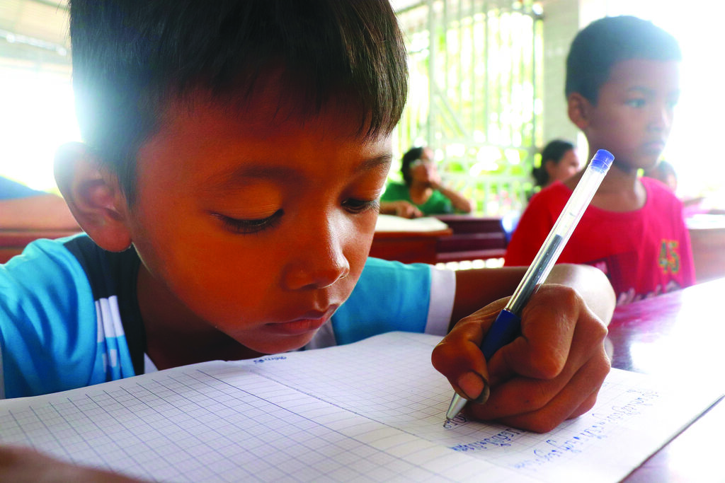 | Élève apprenant à écrire en khmer dans le hameau de Thoi Truong 1, commune de Thoi Xuân. |