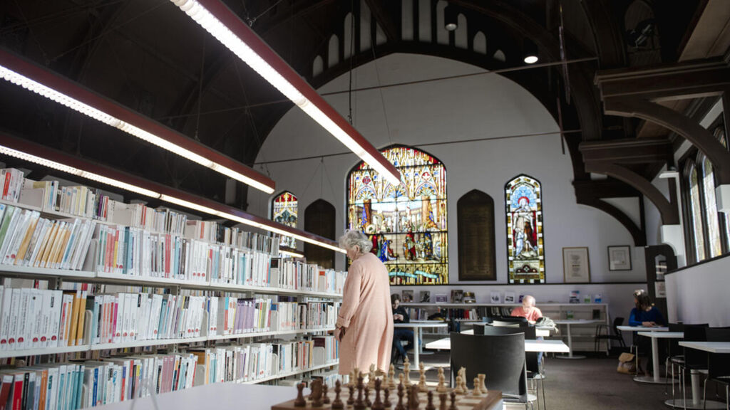 Dans l’un des quartiers centraux et branché de la métropole francophone, cette bibliothèque a remplacé les bancs d’une église anglicane, les arches de bois et les grands vitraux sont toujours là, au-dessus des centaines de livres.