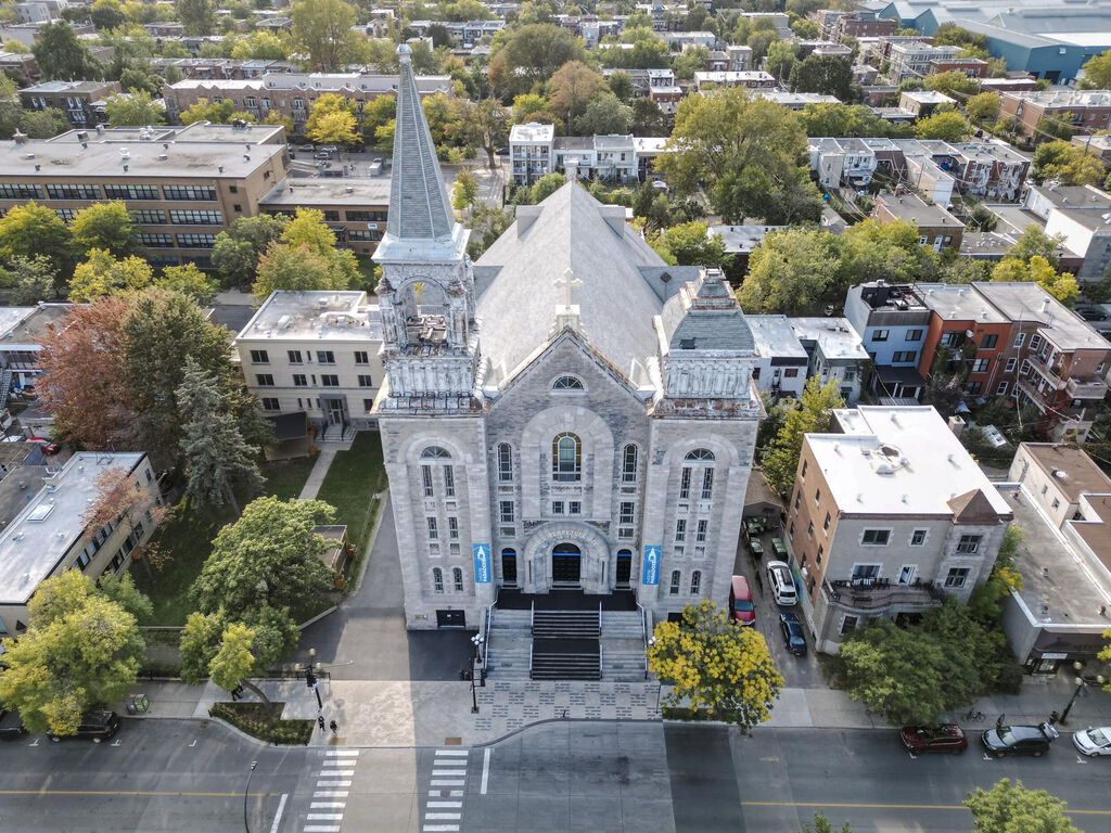 | Vue aérienne de l’extérieur de la garderie La Flûte Enchantée aménagée dans une église de l’arrondissement de Pointes-aux-Trembles à Montréal. |