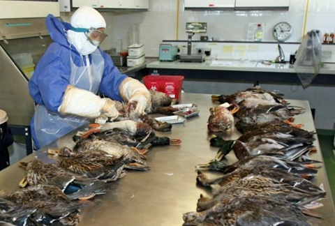 | Une personne de la Direction départementale des services vétérinaires (DDSV) des Alpes-Maritimes effectue des prélèvements sur des cadavres de canards, le 18 septembre 2006 à Sophia-Antipolis, dans le cadre de la surveillance de la grippe aviaire. |