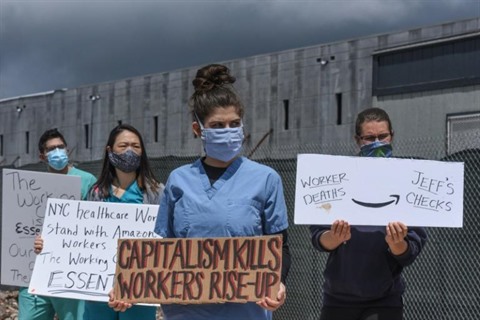 Devant l'entrepôt d'Amazon de Staten Island, à New York, ils étaient une quinzaine à manifester à la mi-journée. Parmi eux, une poignée d'employés du géant des ventes en ligne, mais aussi des salariés des transports en commun ou des infirmières, masqués et armés de pancartes témoignant de leur "solidarité".