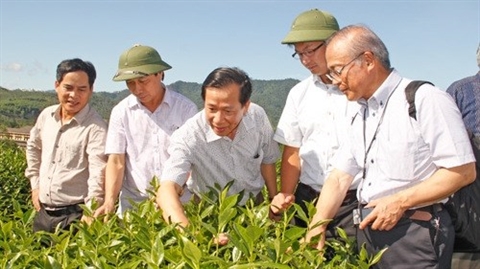 | La délégation japonaise visite les champs de théiers de l’usine de production de thé Ngoc Lâm. |