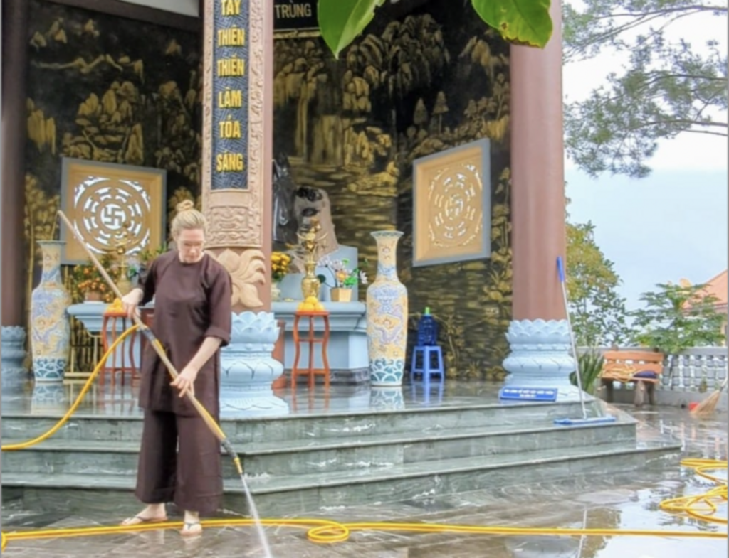 Elle a découvert Thiên Viên Truc Lâm par hasard grâce à ses recherches sur Internet et sur certains forums de voyage. À la recherche d'un lieu pour expérimenter la vie spirituelle du peuple vietnamien, elle a demandé aux gestionnaires du monastère la permission d'y séjourner en tant que laïque pendant deux semaines. La femme allemande a acheté deux ensembles de vêtements bleus et marron et, avec 20 autres laïcs étrangers, elle a commencé une vie de pratique, de méditation et d'actes méritoires.