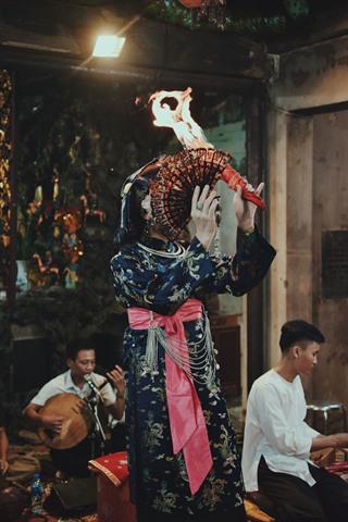 À l’inverse, "Cô Dôi thuong ngàn", gardienne des montagnes et des forêts, se manifeste dans une gestuelle puissante, souvent armée de sabres ou d’arcs. Les mouvements sont énergiques et précis, portés par une musique intense qui glorifie ses exploits de défense des espaces sylvestres.