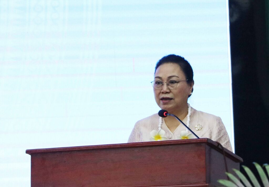 | L'ambassadrice du Laos au Vietnam, Khamphao Ernthavanh, s'exprimant lors de la célébration de la fête Bunpimay à l'Université de Thai Nguyên. |