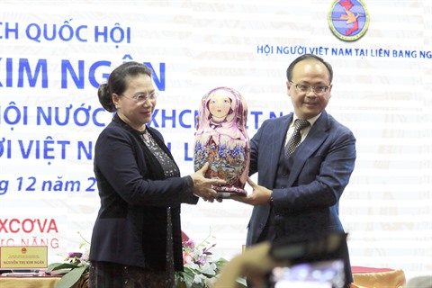 | La présidente de l'Assemblée nationale Nguyên Thi Kim Ngân rencontre des représentants de la communauté des Vietnamiens en Russie, le 9 décembre à Moscou. |