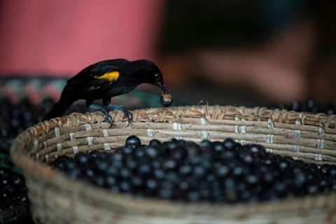 | Un oiseau mange un fruit du palmier açaï dans le panier d'un marchand brésilien, Evandro Santos, le 11 juin à Sao Jose, dans l'État de Para, au Brésil. |