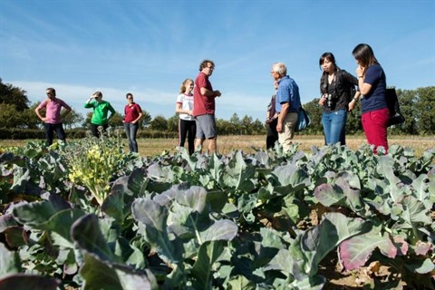| Le journaliste Douwe Korting informe les consommateurs locaux de l'état des champs de légumes de la ferme collective de Boxtel. |