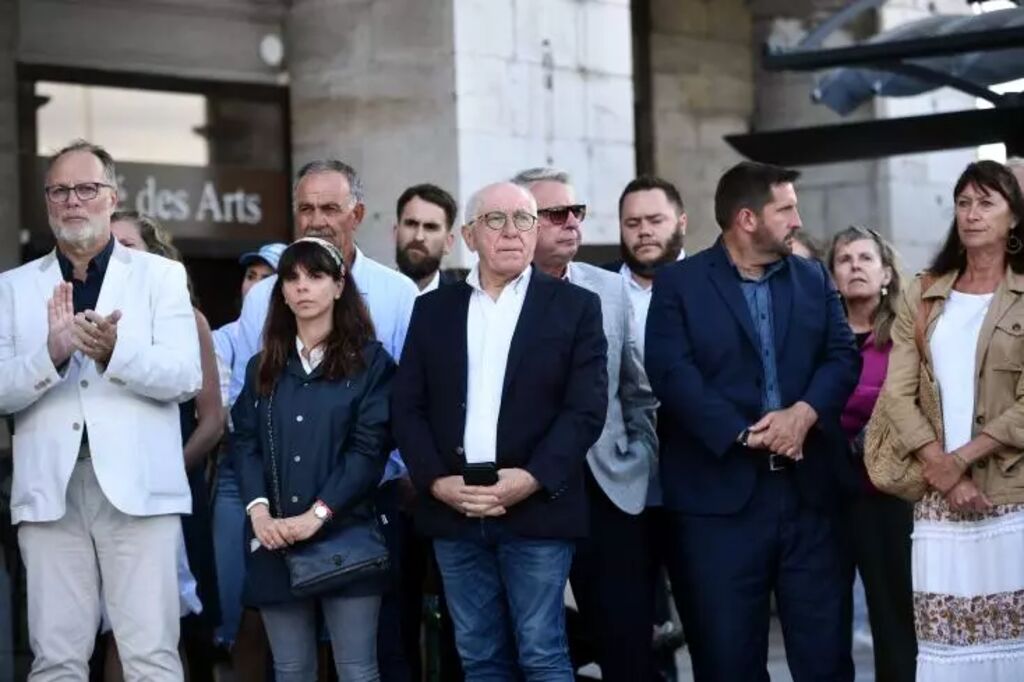 | Le maire de Bayonne, Jean-René Etchegaray, assiste au rassemblement en hommage à l'homme mortellement agressé fin juillet lors des fêtes de la Ville, le 4 août 2023. |