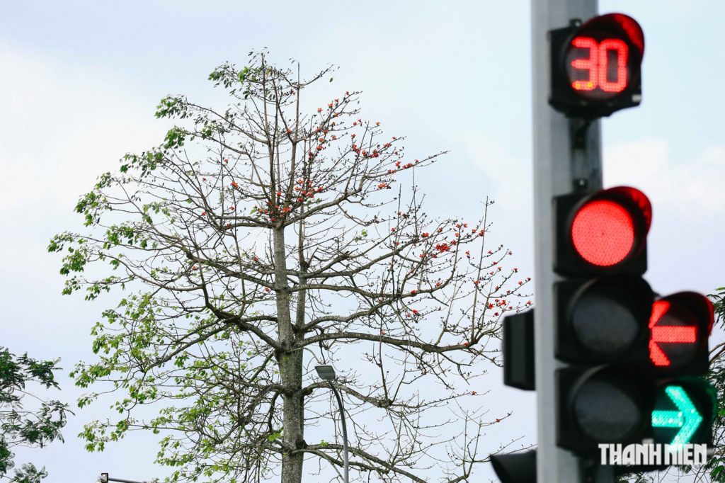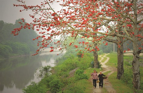 | Ces jours-ci, en passant le pont de Da Viên, beaucoup de personnes sont attirées par la beauté des fleurs de bombax ceiba. Photo : Lê Hoài Nhân/CVN |