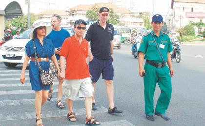 | Un agent de maintien de l’ordre aide aux touristes à traverser la rue à Hô Chi Minh-Ville. Photo : CTV/CVN |