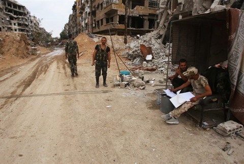 | Des soldats syriens devant des immeubles détruits à Douma, le 11 avril. |