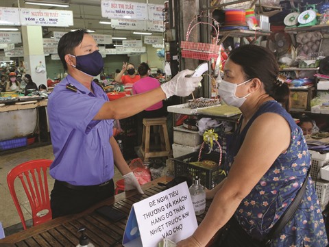 | Contrôle de la température corporelle dans un marché à Dà Nang (Centre). |