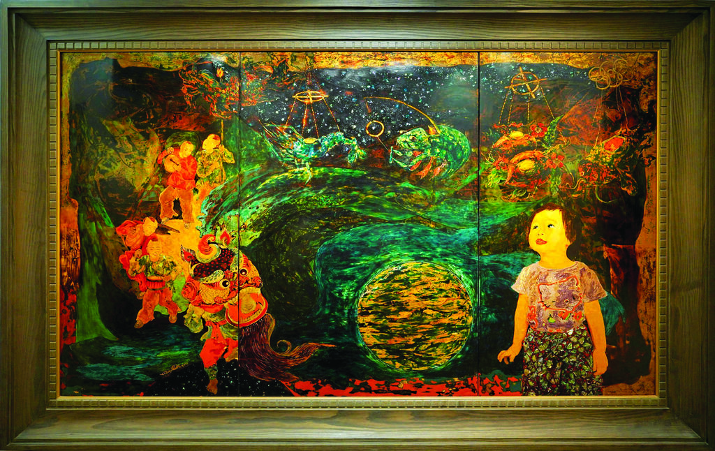 La peinture raconte l’histoire d’une nuit d’août sous la pleine lune, avec les yeux rêveurs d’une petite fille levés vers le ciel, accompagnés des images de la Fête de la mi-automne : la danse du lion, la procession aux lanternes et les gâteaux de lune.