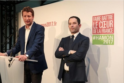 | Benoît Hamon (droite) et Yannick Jadot, lors de la dernière campagne présidentielle, le 26 février 2017 à Paris. |