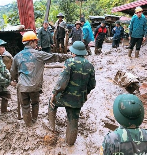 | Les sauveteurs recherchent les disparus à la suite des glissements de terrain provoqués par des pluies torrentielles, dans le district de Phong Thô, province montagneuse de Lai Châu (Nord), le 3 août. |