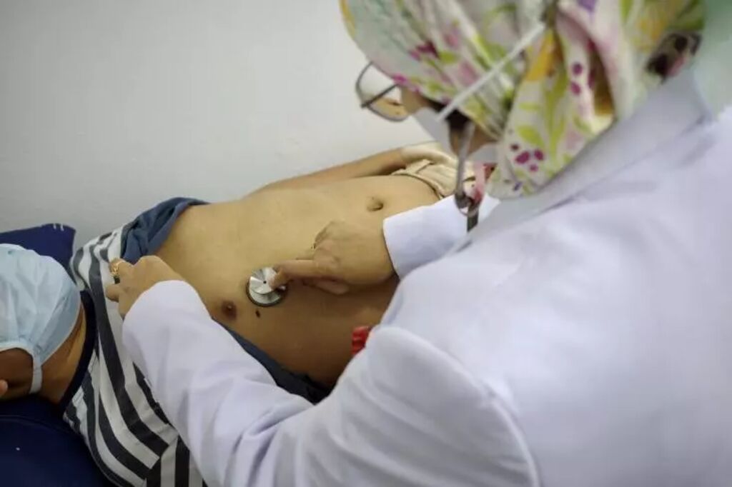 | Feni Fitriani Taufik (à droite), spécialiste des poumons, examine un patient pour des problèmes respiratoires à l'hôpital de Jakarta, le 21 août. |