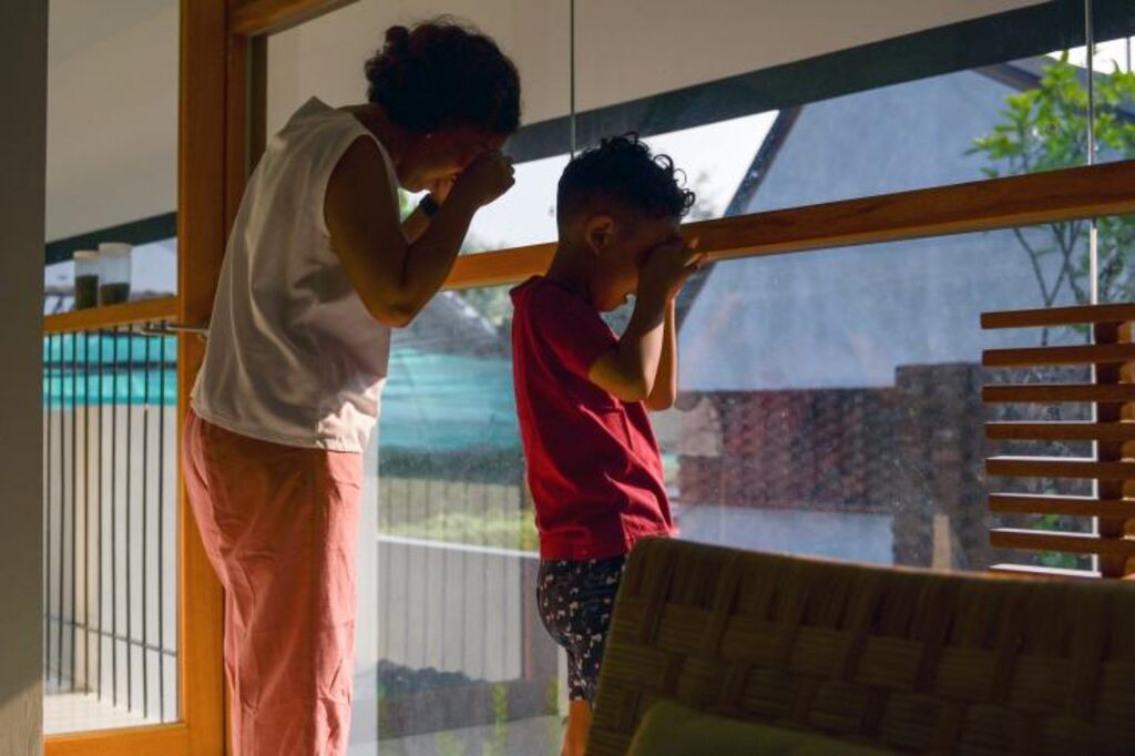 | Cempaka Asriani et son fils de six ans, qui a contracté une toux persistante en raison de la pollution de l'air à Jakarta, le 29 août. |
